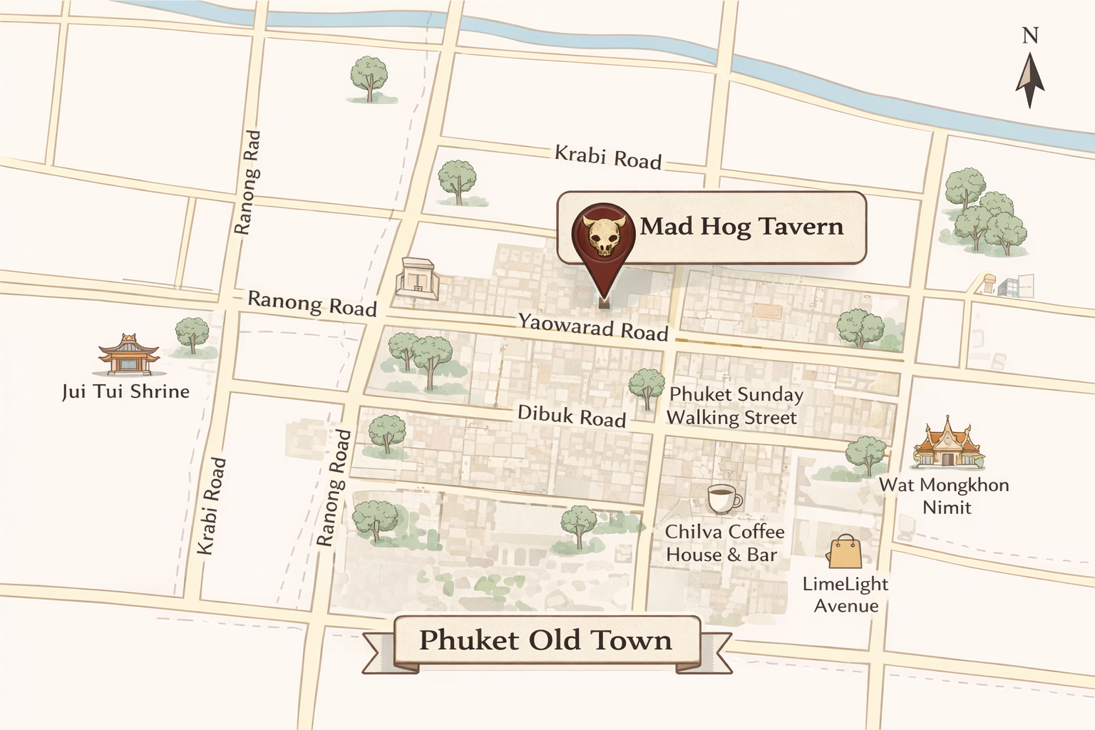 Mad Hog Tavern is located on Yaowarad Road in Phuket Old Town, right in the historic heart of the city. This area is known for its colorful Sino-Portuguese buildings, cafés, night markets, and easy walkability—making the tavern a natural stop while exploring Old Town on foot.