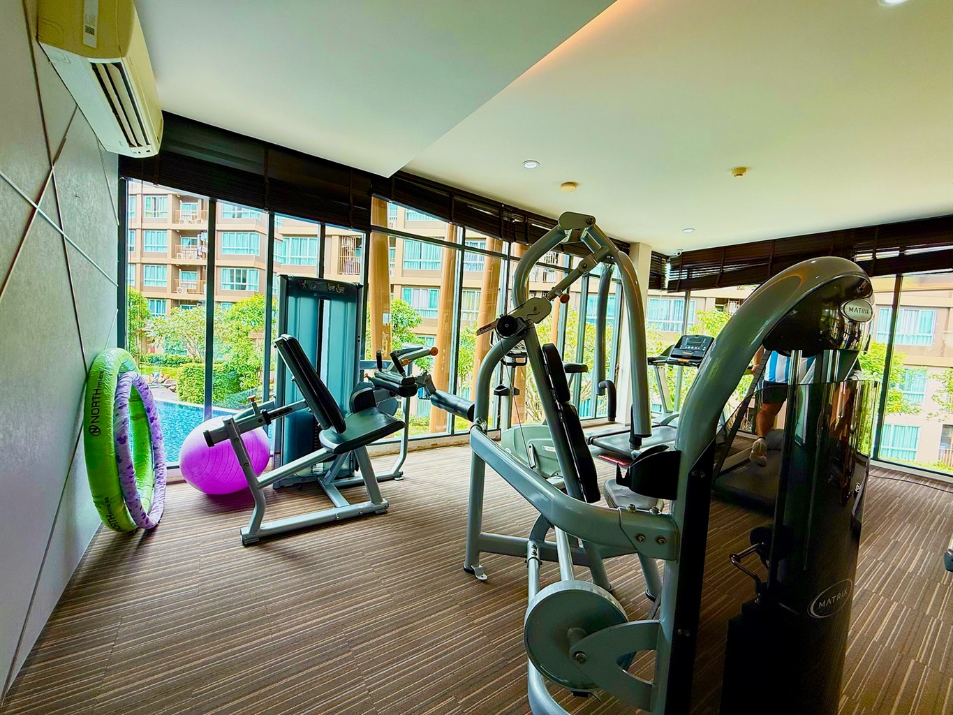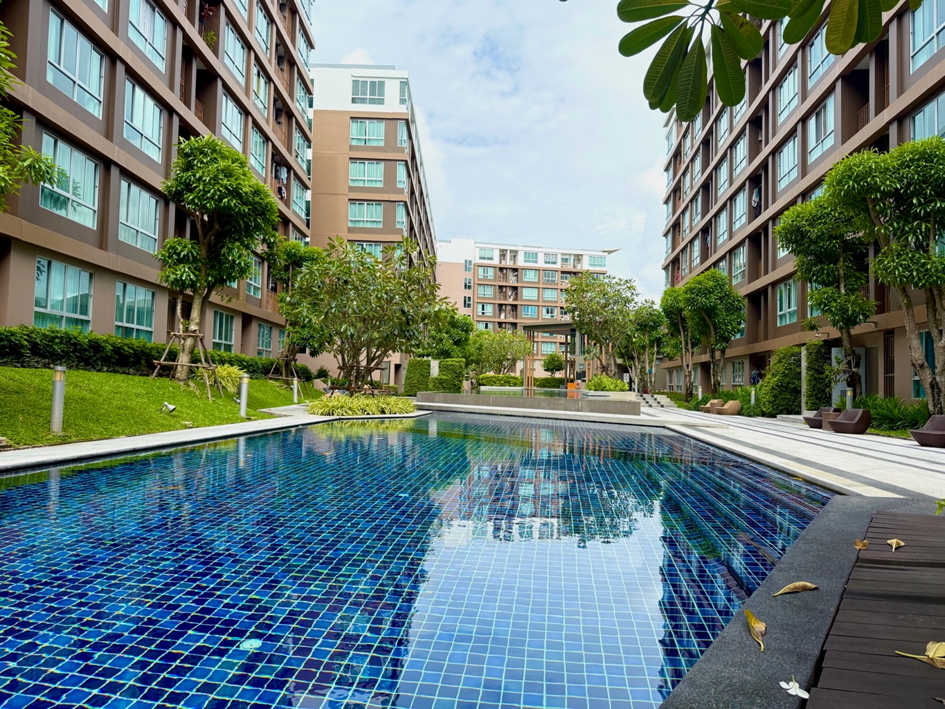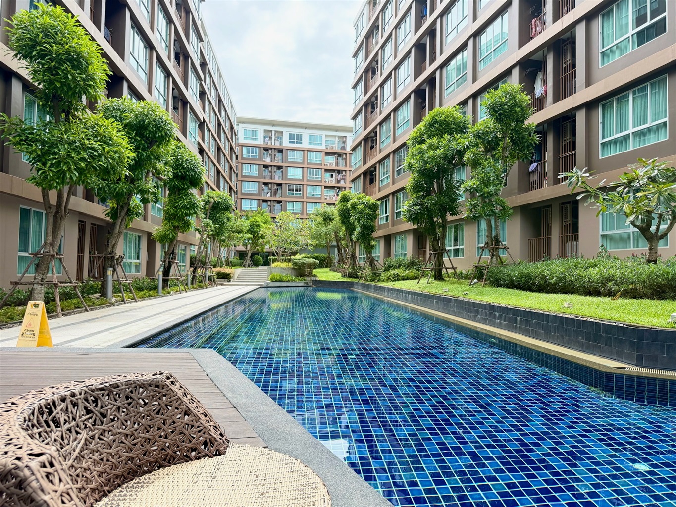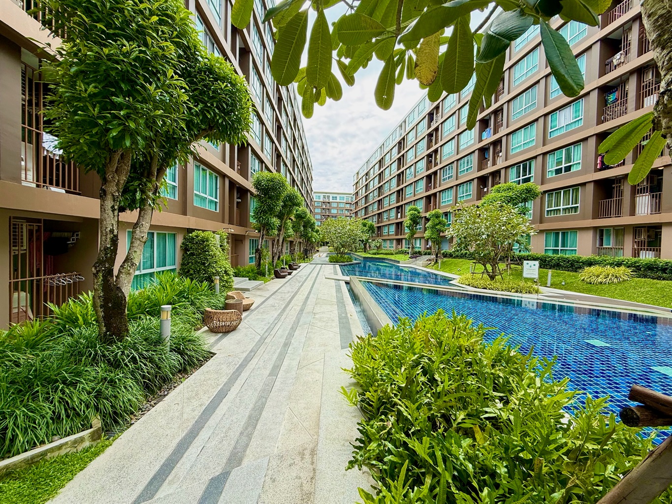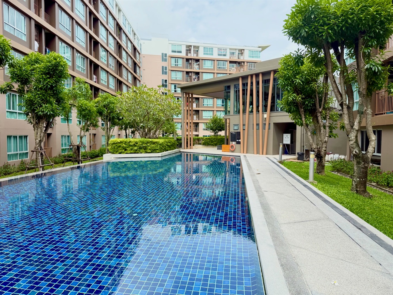 The complex's amenities include a swimming pool and a gym. Dining and shopping options and a motorbike rental place are within walking distance.