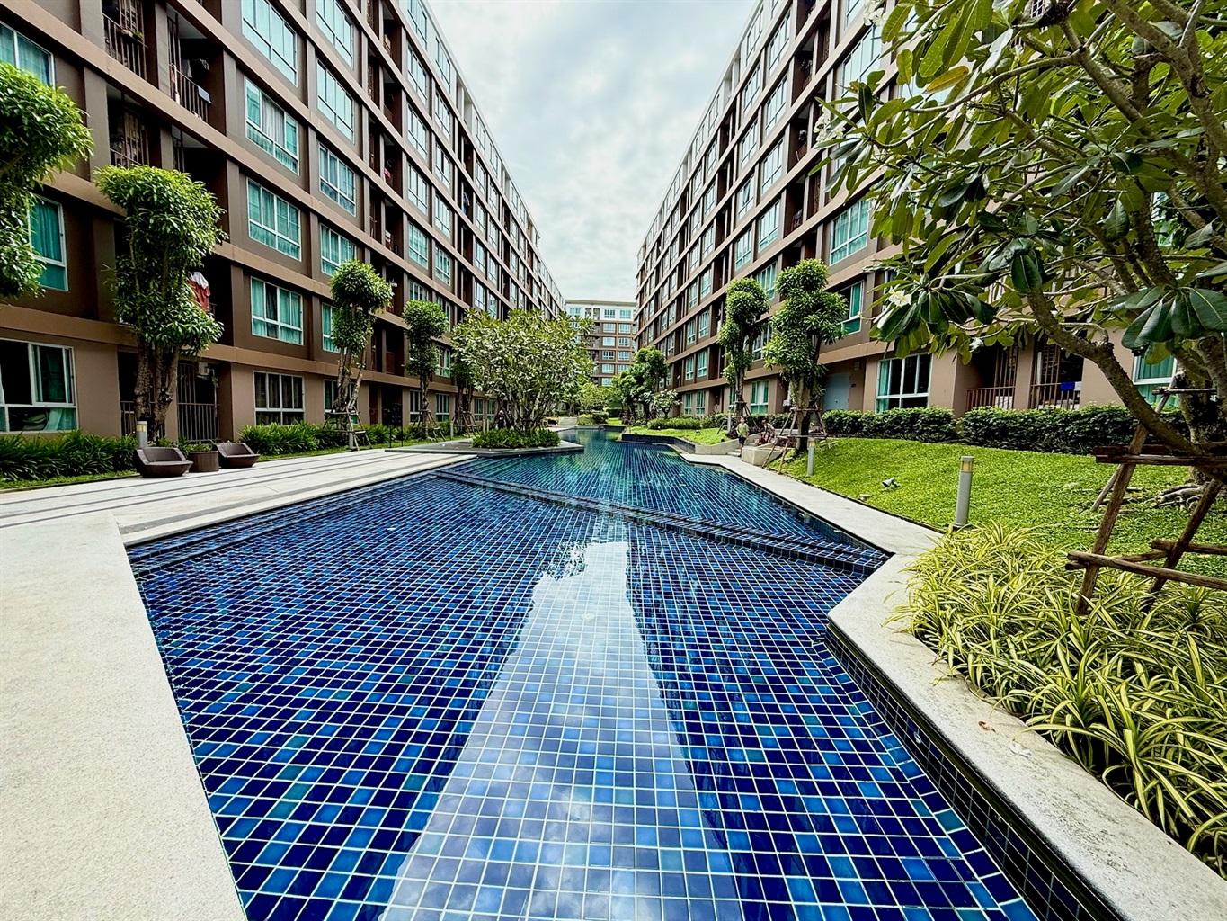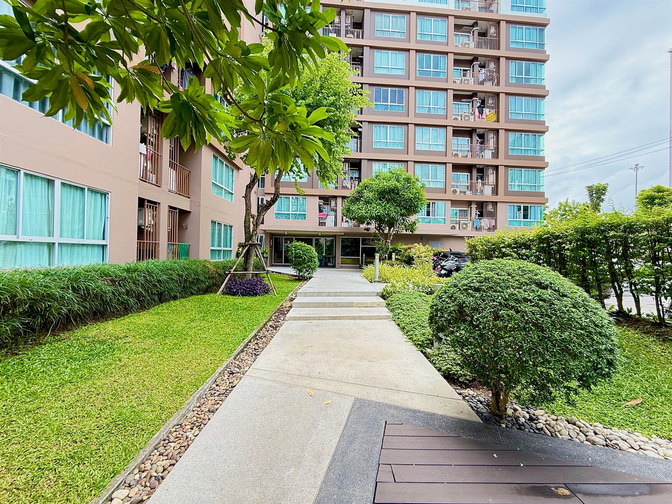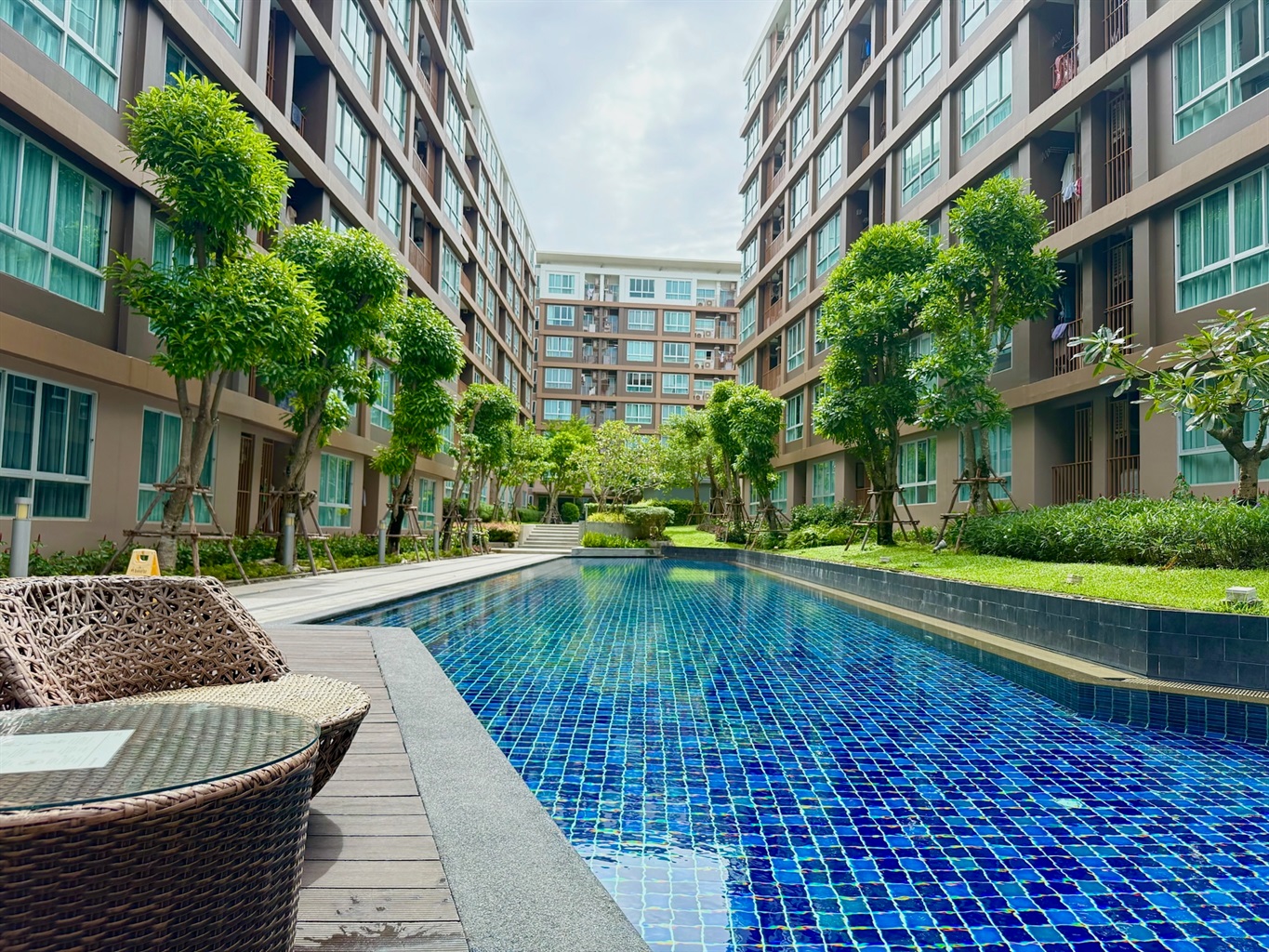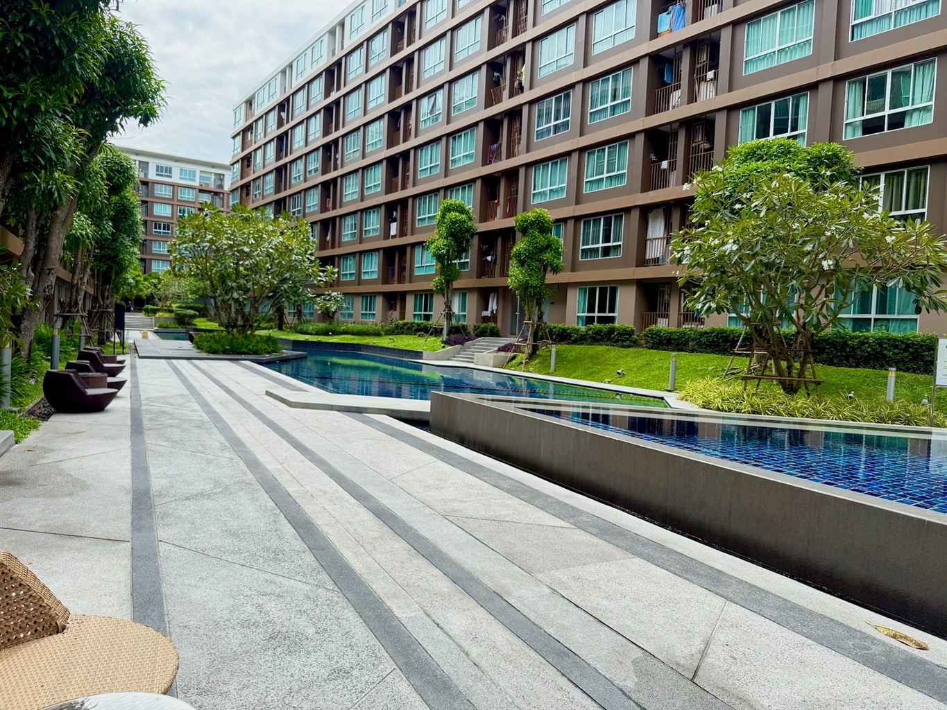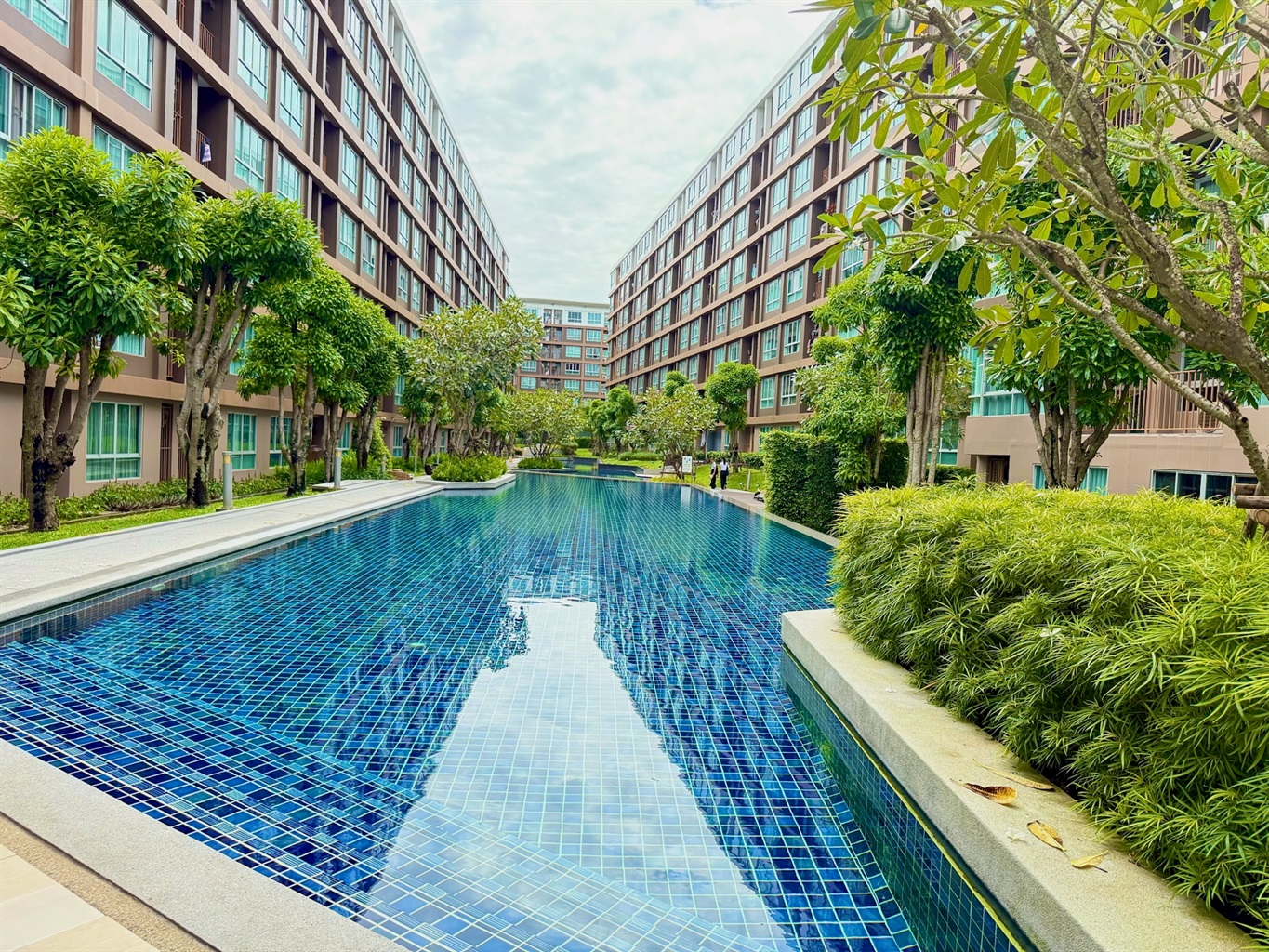 The complex's amenities include a swimming pool and a gym. Dining and shopping options and a motorbike rental place are within walking distance.