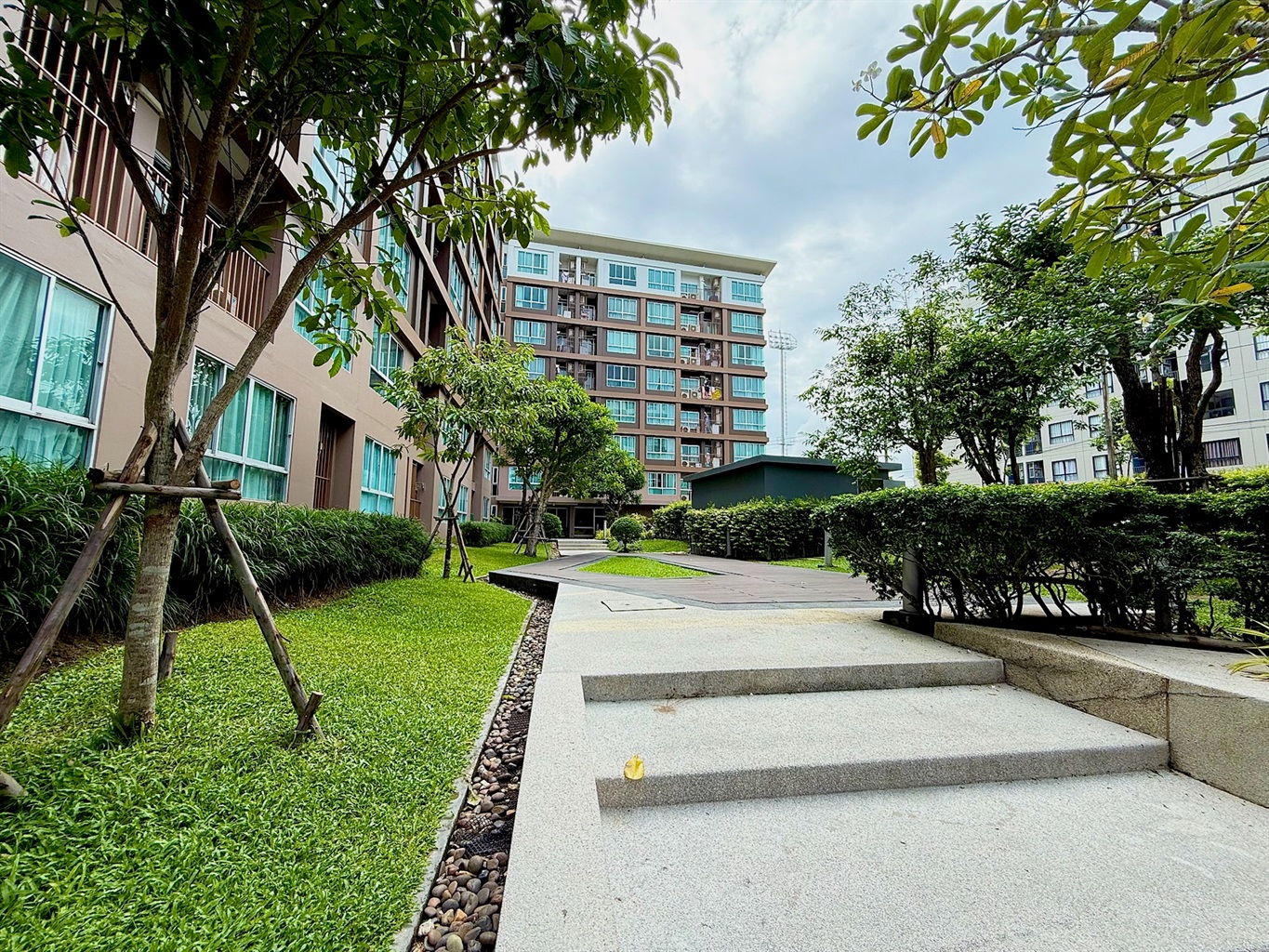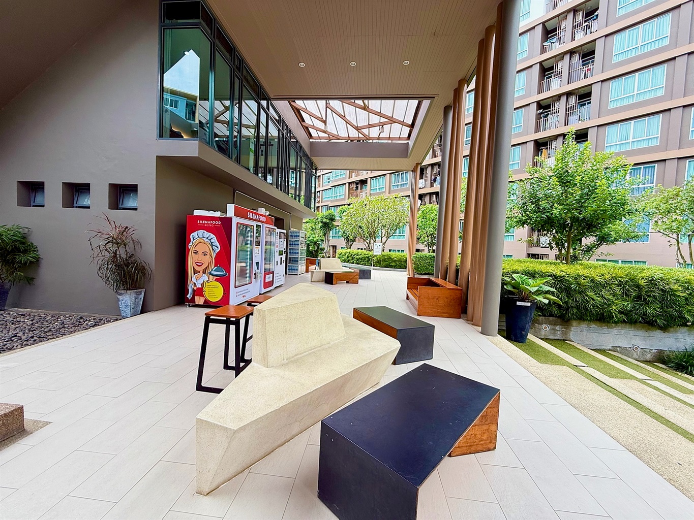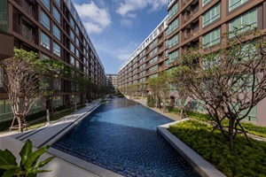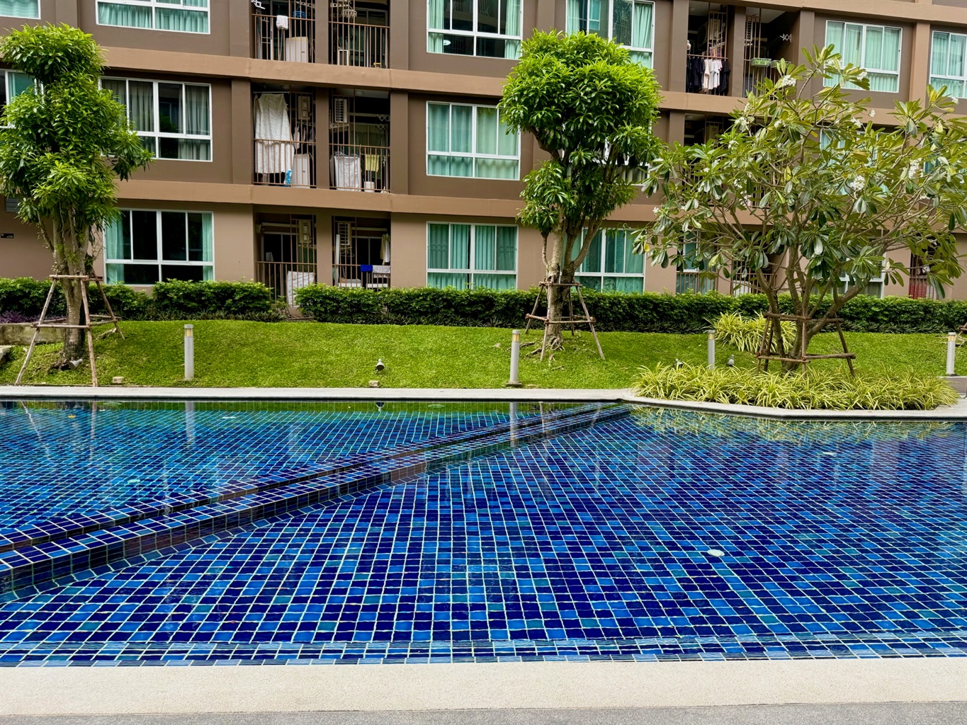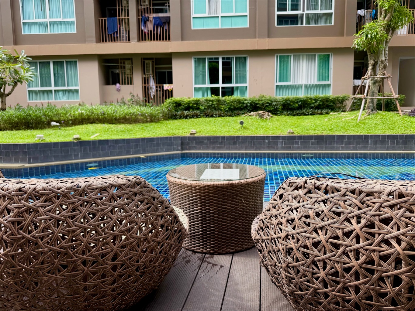 The complex's amenities include a swimming pool and a gym. Dining and shopping options and a motorbike rental place are within walking distance.