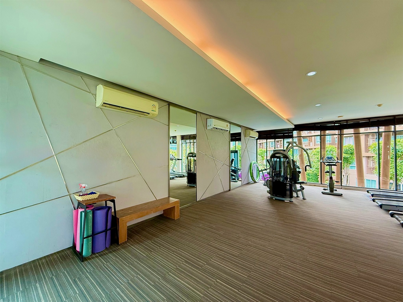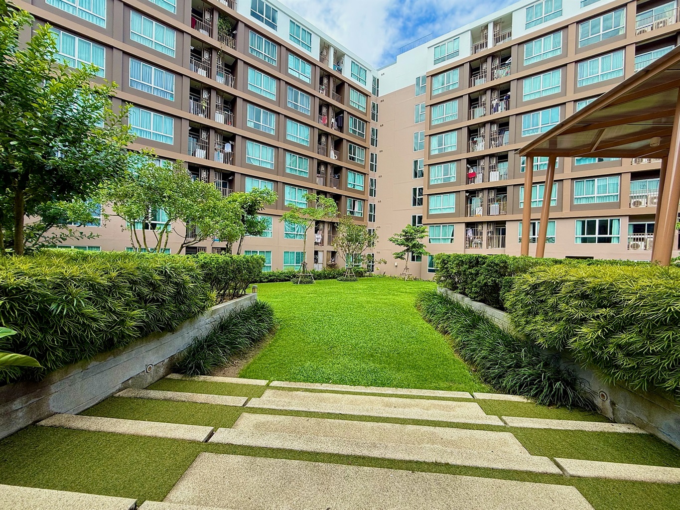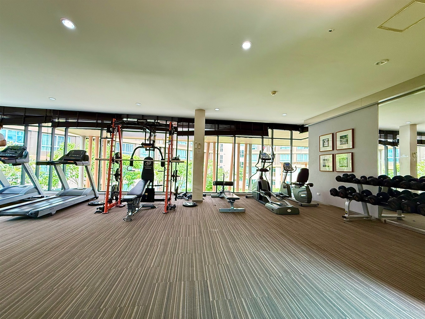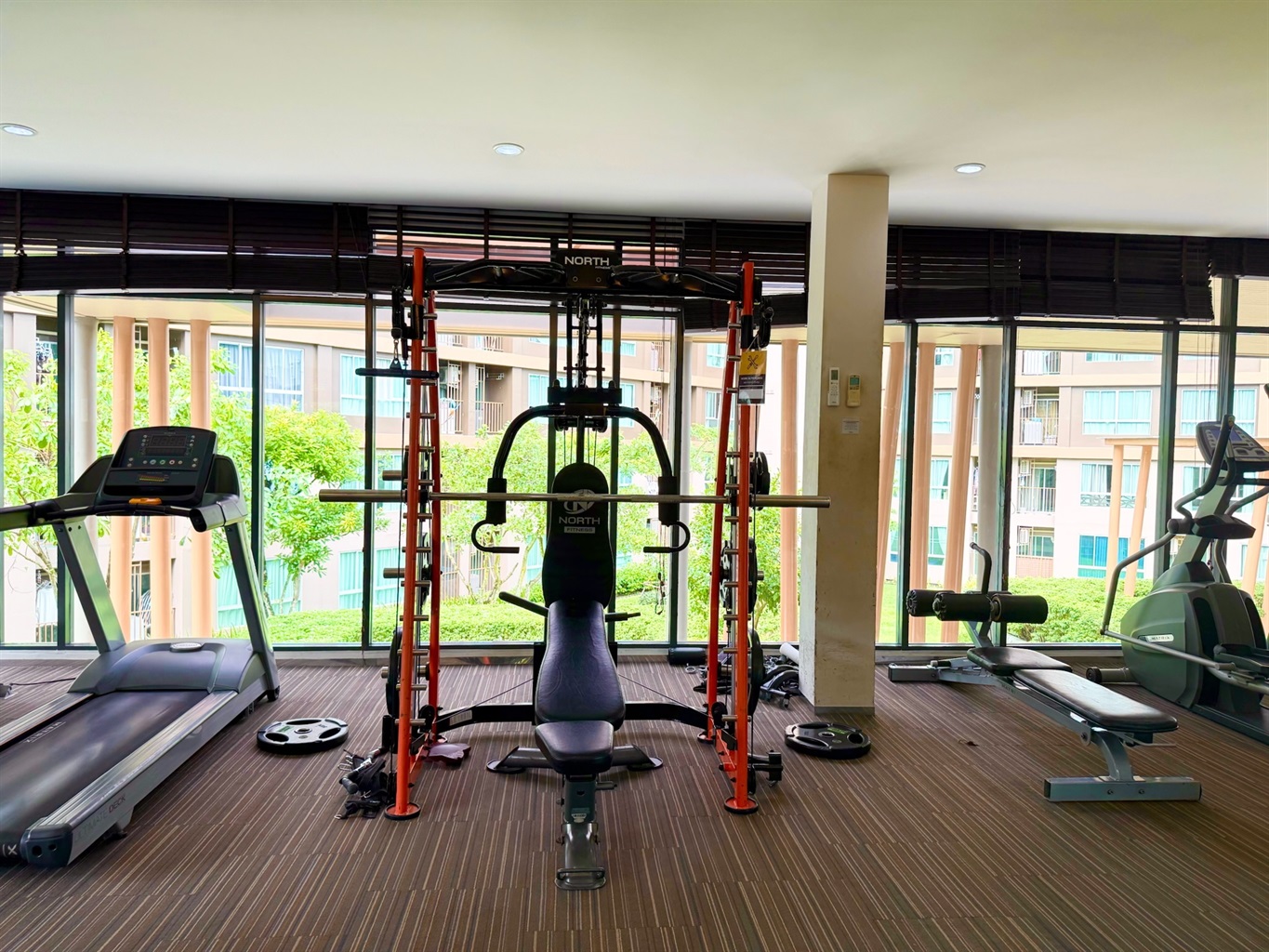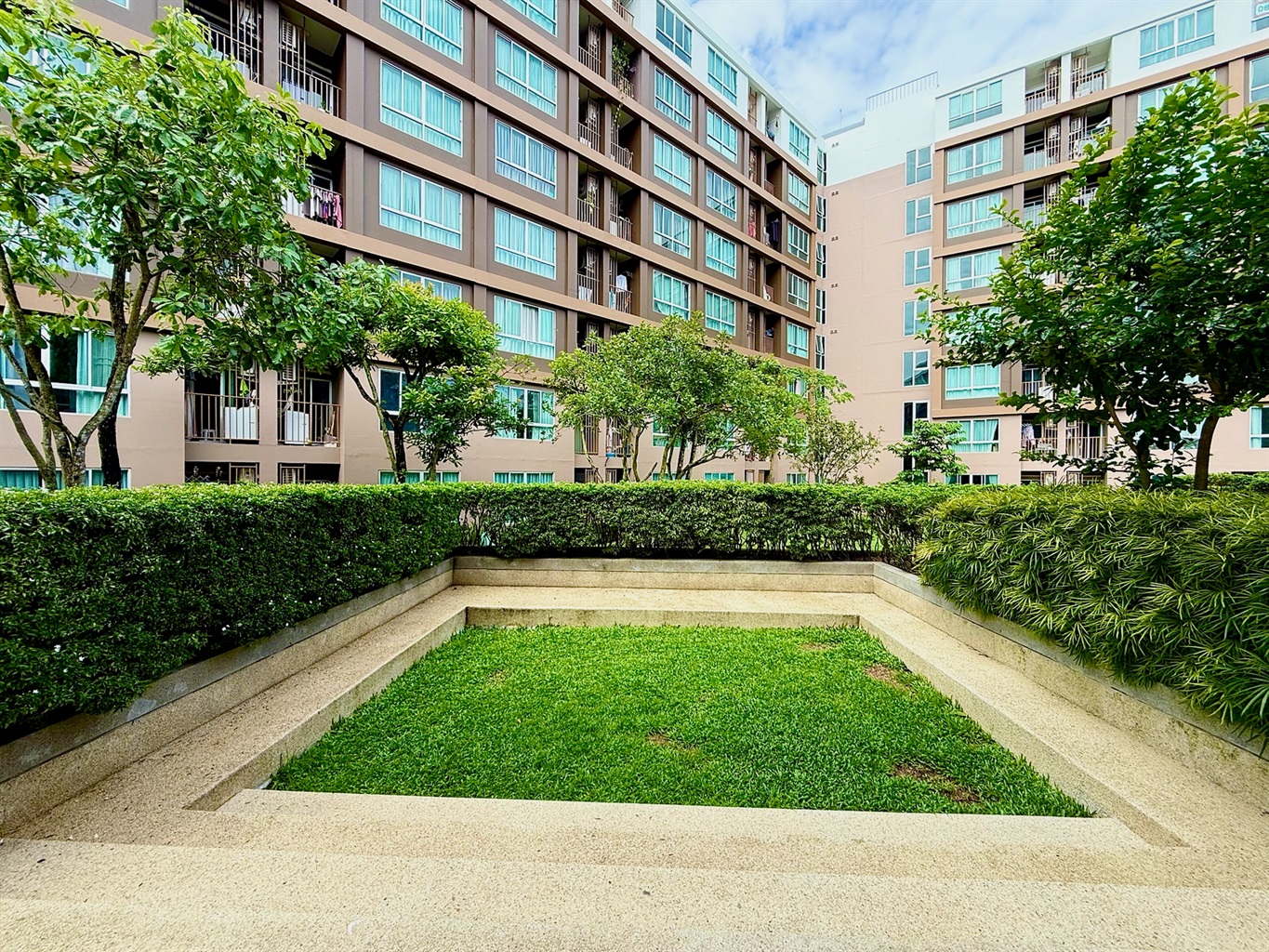 The complex's amenities include a swimming pool and a gym. Dining and shopping options and a motorbike rental place are within walking distance.